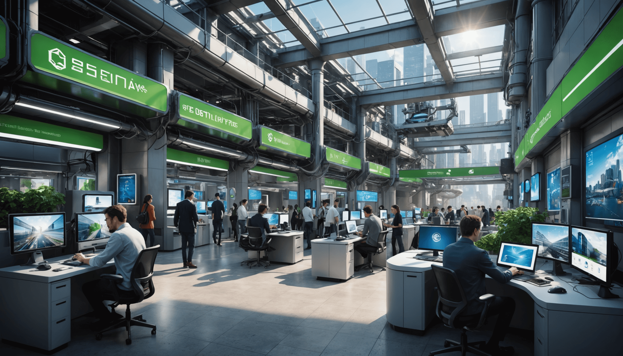 futuristic urban innovation, diverse technology, integrating connectivity, vibrant digital displays, sleek gadgets and robotics, advanced digital environment, everyone interacting enthusiastically, dynamic innovative technology, green tech integrated seamlessly, high tech inspiring landscape
